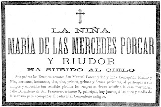 Sus padres los Excmos. señores don Manuel Porcar i Tió y doña Concepción Riudor y Nin, hermano, hermanas, tíos, tías, primos, primas y demás parientes, al participar á sus amigos y conocidos tan sensible pérdida les ruegan se sirvan asistir á la casa mortuoria calle Dormitorio de San Francisco, número 9, principal, hoy jueves, á las once y media de la mañana para acompañar el cadáver al Cementerio antiguo.